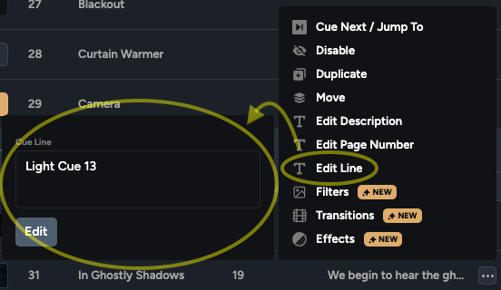For example, if you wanted Cue 31 to happen in conjunction with a light cue, you could easily edit the cue sheet to reflect the light cue as the Cue Line instead of the provided line from the script. You would click [Edit Line] and type the new cue ("Light Cue 13", for example) into the box.