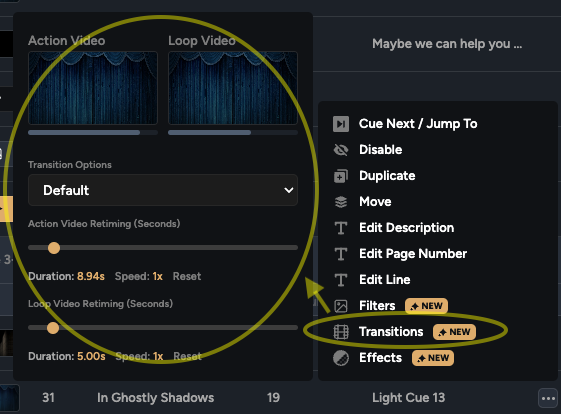 At the top is a small visual of the Action and Loop videos. Unlike our Cue Previews, in this menu, you will actually see the video play out. The bar underneath each video demonstrates how quickly or slowly each video is moving.